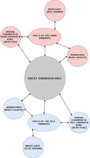 Bubble diagram outlining spatial relationships between the different regions of the map, used during early concepting of the level.