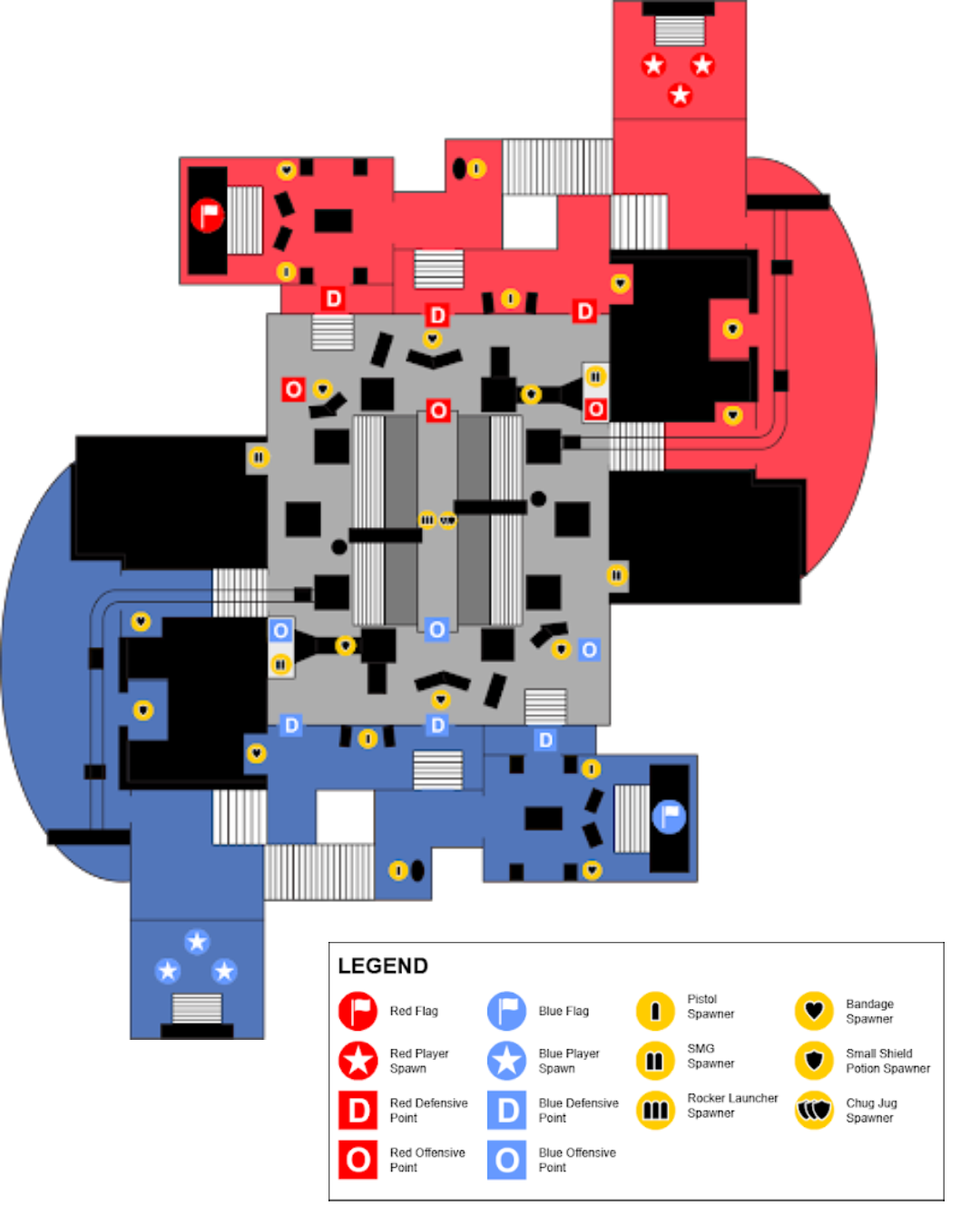 Each team's side of the map features low-value items, such as Health Packs, Small Shield Potions and Pistols, in easily accessible locations.